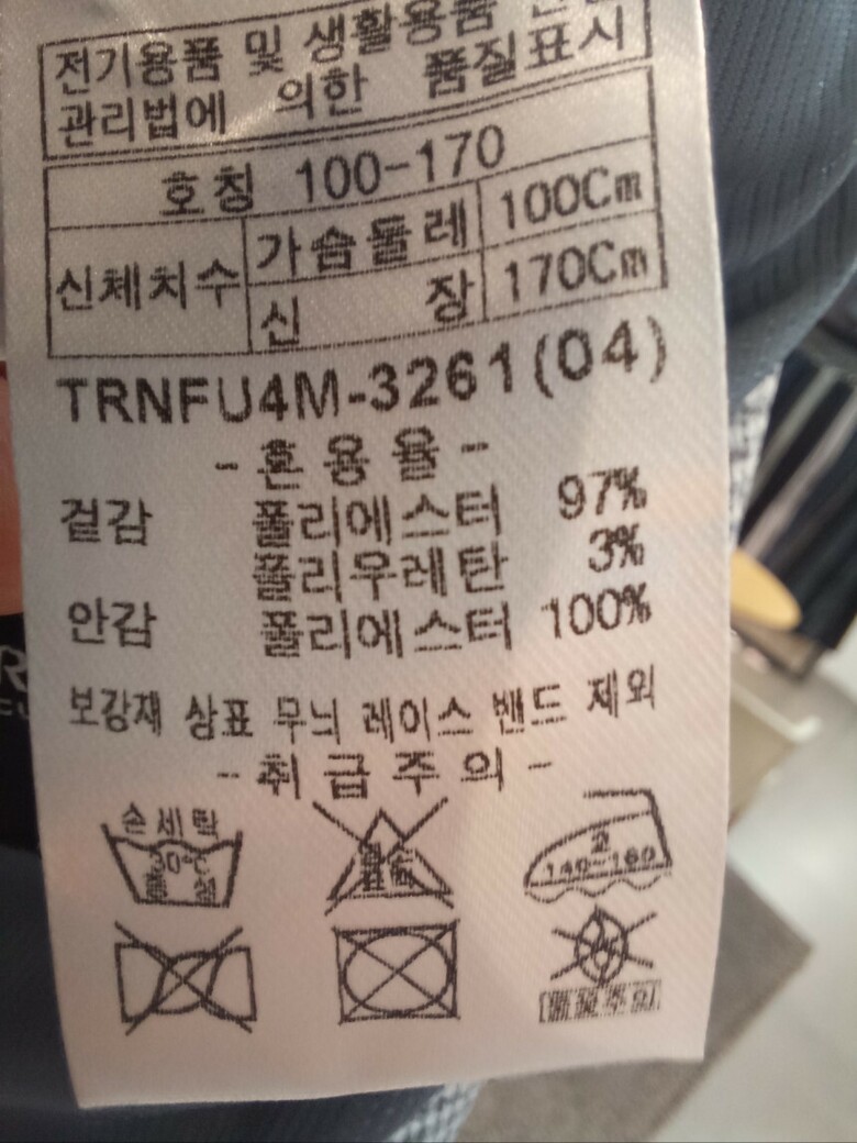 | 1. 제품 소재 (섬유의 조성 또는 혼용률을 백분율로 표시, 기능성인 경우 성적서 또는 허가서) | 겉감:폴리에스테르 97%, 폴리우레탄 3% / 안감:폴리에스테르 100% |