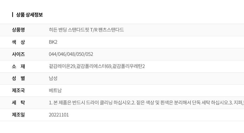 | 1. 제품 소재 (섬유의 조성 또는 혼용률을 백분율로 표시, 기능성인 경우 성적서 또는 허가서) | 겉감레이온29,겉감폴리에스터69,겉감폴리우레탄2 |