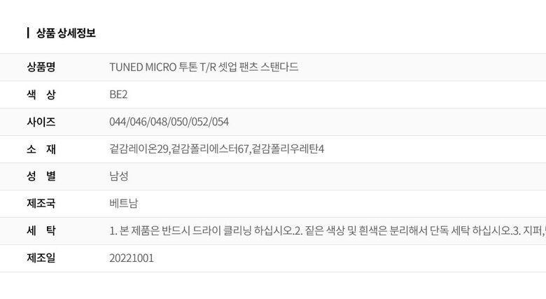 | 1. 제품 소재 (섬유의 조성 또는 혼용률을 백분율로 표시, 기능성인 경우 성적서 또는 허가서) | 겉감레이온29,겉감폴리에스터67,겉감폴리우레탄4 |