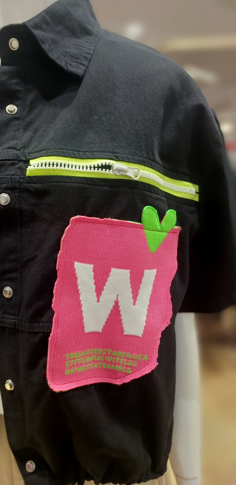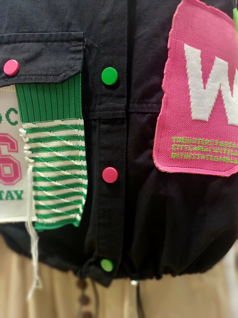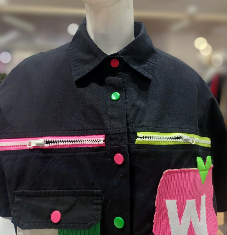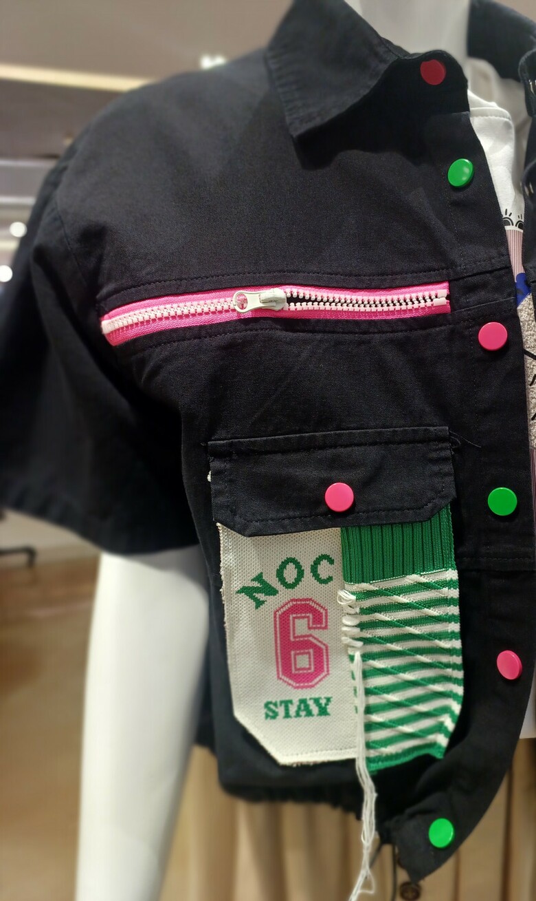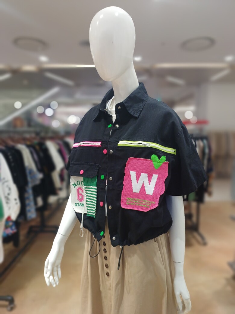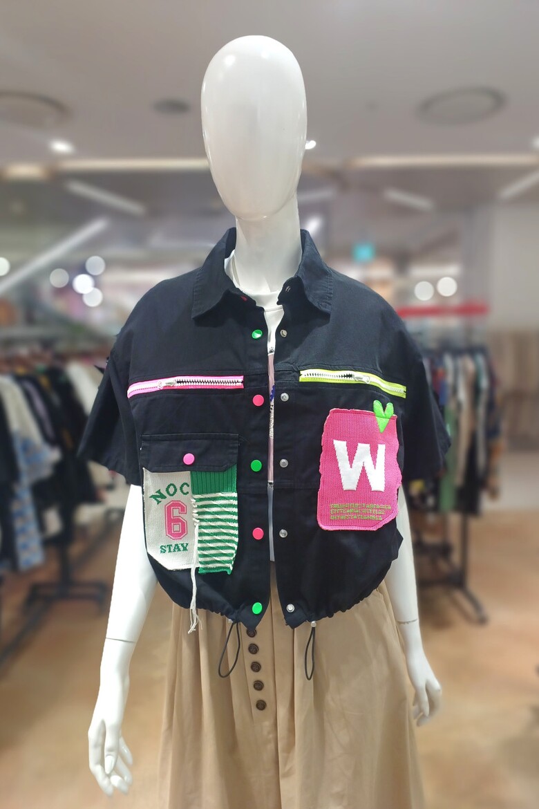 색상이 독보이는 니트패치 반팔 자켓 입니다