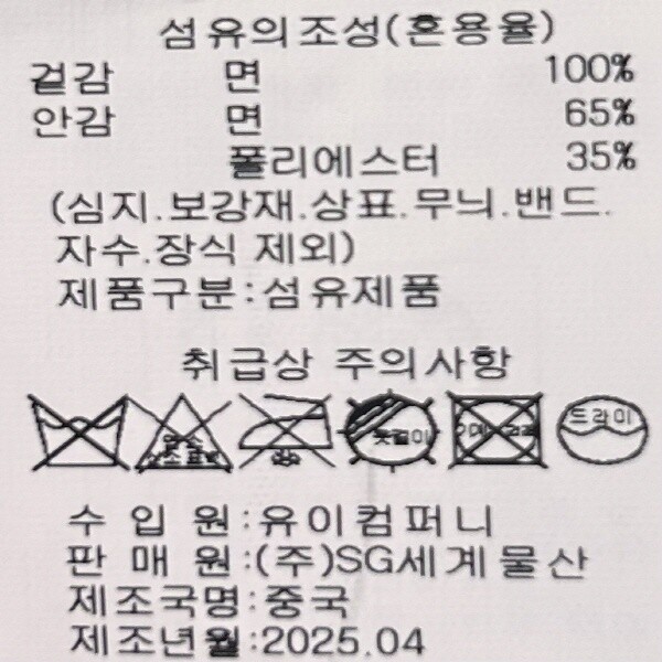 제품소재 : 겉감-면100% , 안감-면65%, 폴리에스터35%