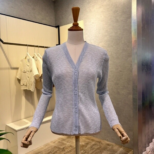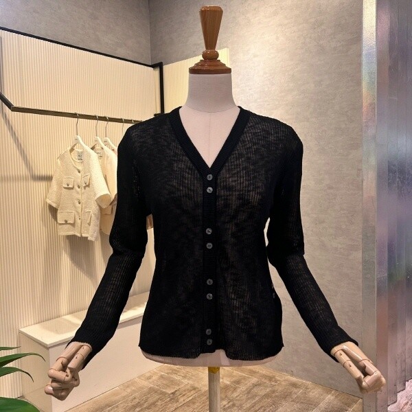 2025년 s/s 신상 레이온 혼방 시스루 브이넥 가디건 입니다. 여성스러운 디자인으로 코디 아이템 입니다.