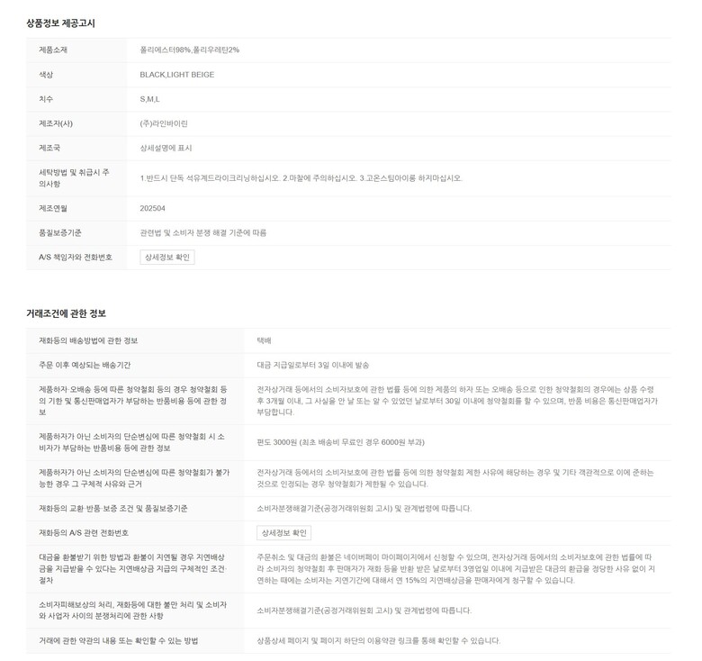 | 6. 세탁방법 및 취급시 주의사항 | 상품상세참조 |