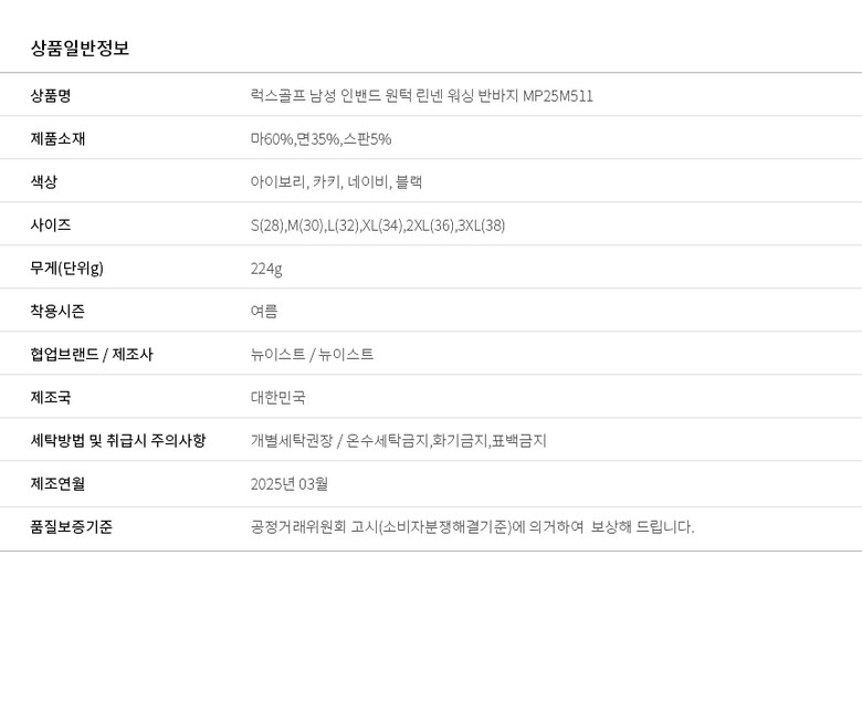 | 1. 제품 소재 (섬유의 조성 또는 혼용률을 백분율로 표시, 기능성인 경우 성적서 또는 허가서) | 상세설명참고 |