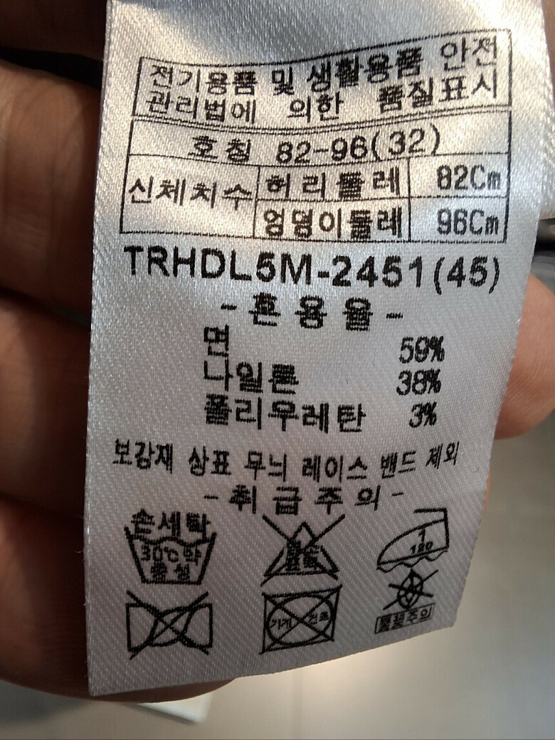 | 1. 제품 소재 (섬유의 조성 또는 혼용률을 백분율로 표시, 기능성인 경우 성적서 또는 허가서) | 면 59%, 나일론 38%, 폴리우레탄 3% |