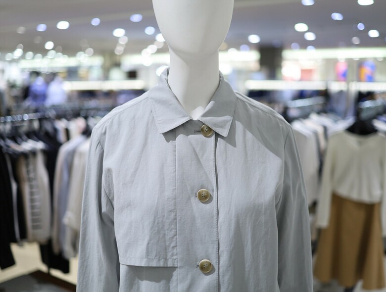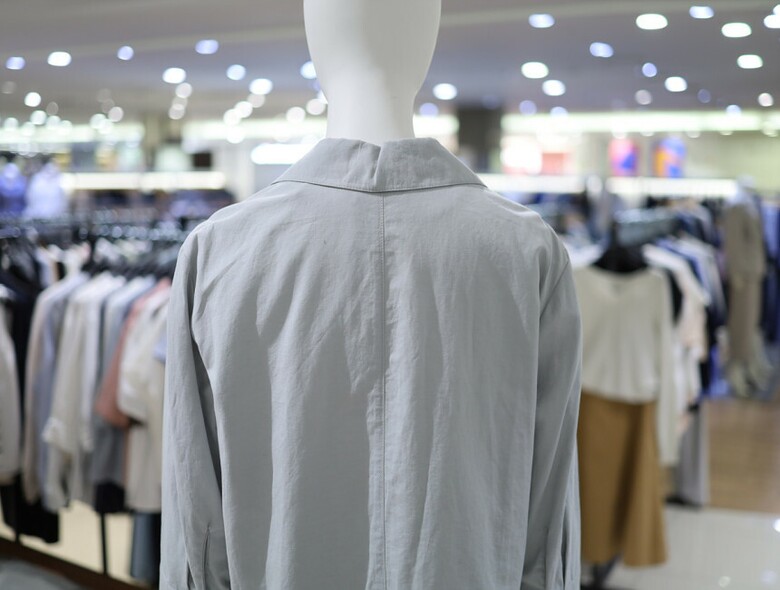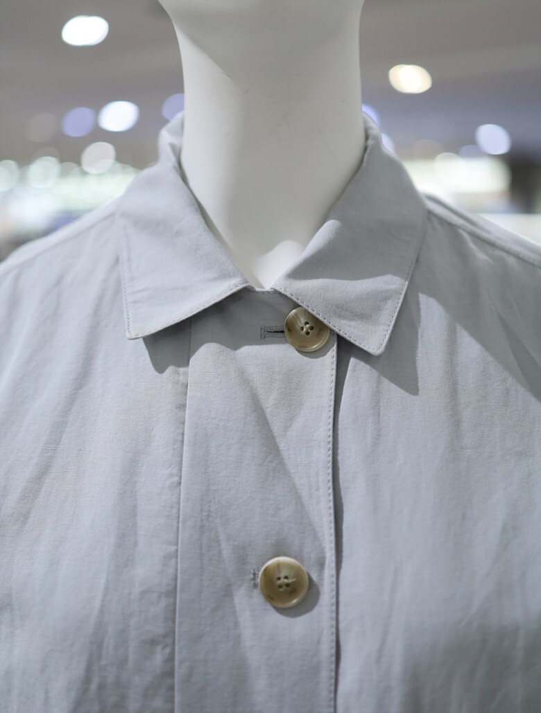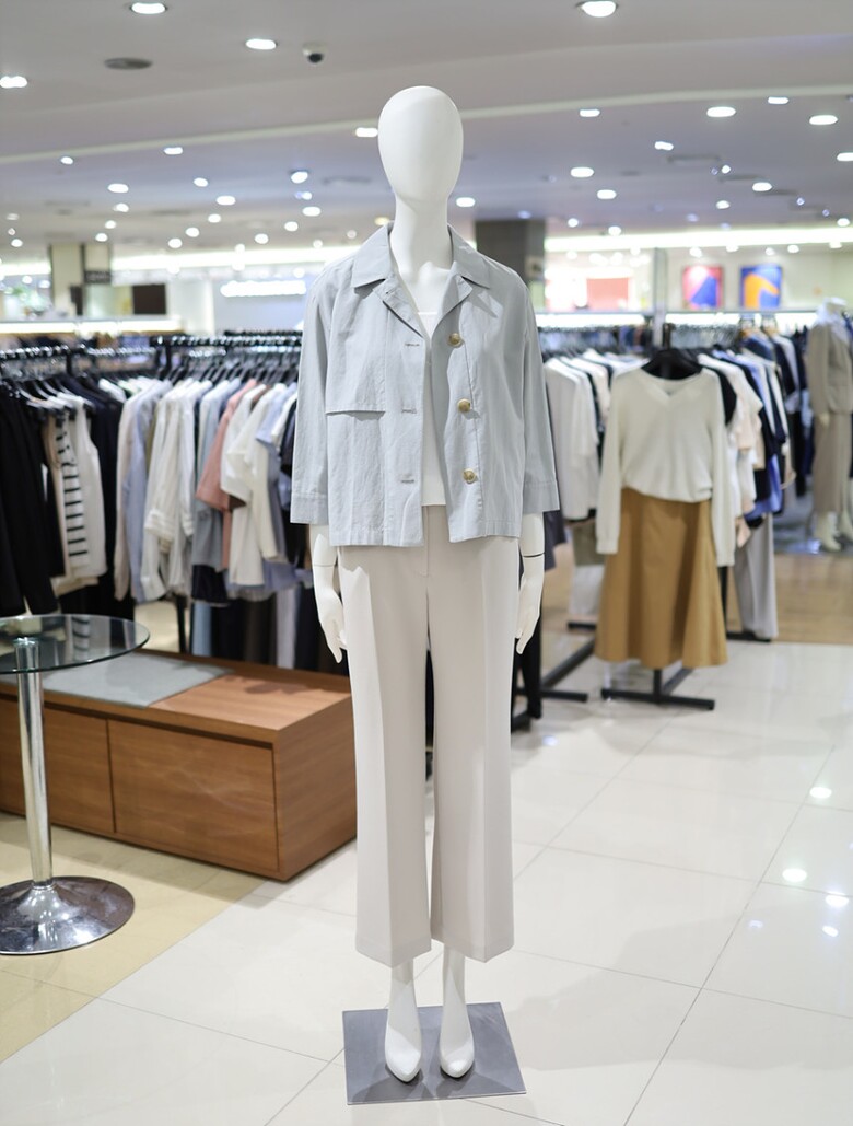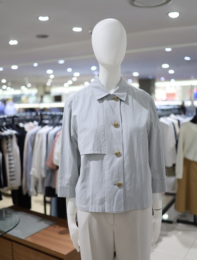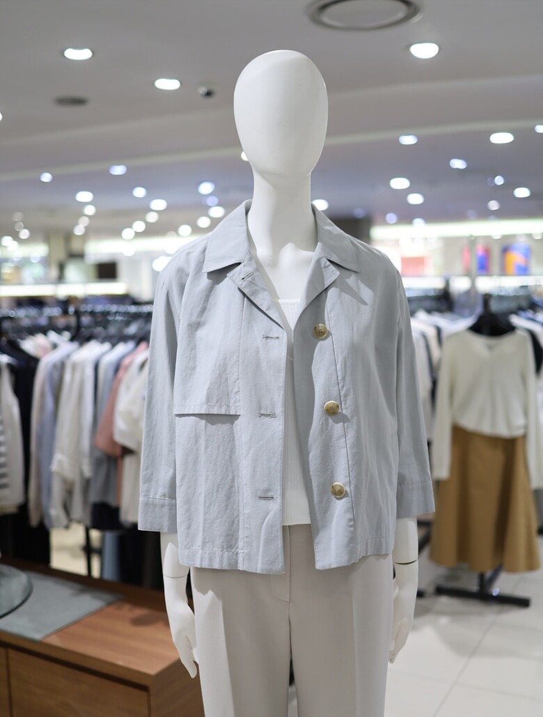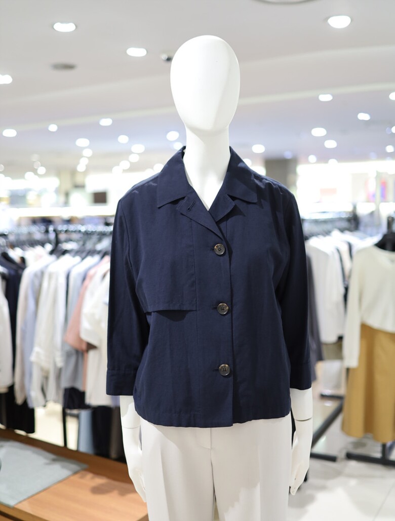 우드톤 버튼과 한쪽 플랩포켓 디테일이 포인트가 되며
