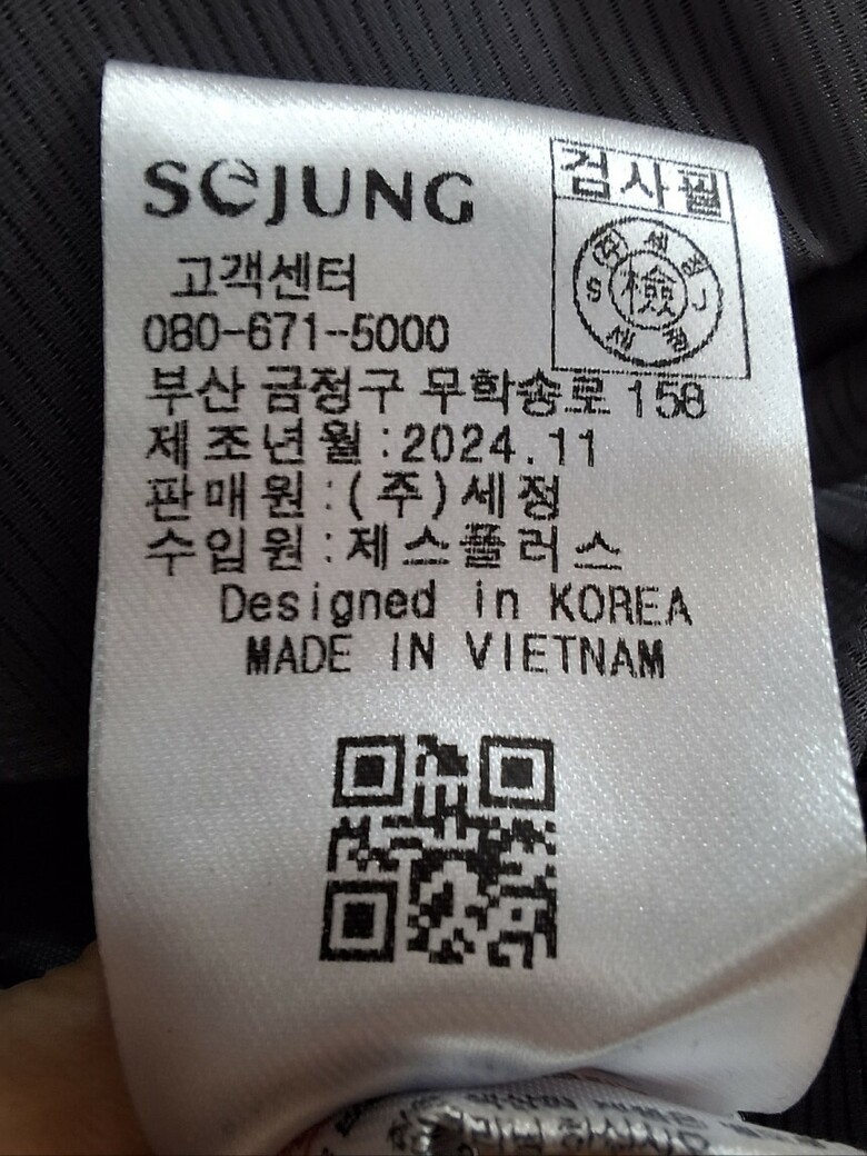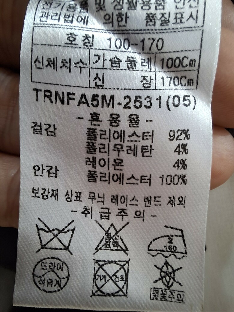 | 1. 제품 소재 (섬유의 조성 또는 혼용률을 백분율로 표시, 기능성인 경우 성적서 또는 허가서) | 겉감:폴리에스테르 92%, 폴리우레탄 4%, 레이온 4% / 안감:폴리에스 |