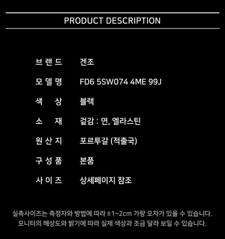 | 1. 제품 소재 (섬유의 조성 또는 혼용률을 백분율로 표시, 기능성인 경우 성적서 또는 허가서) | 상세페이지 참조 |