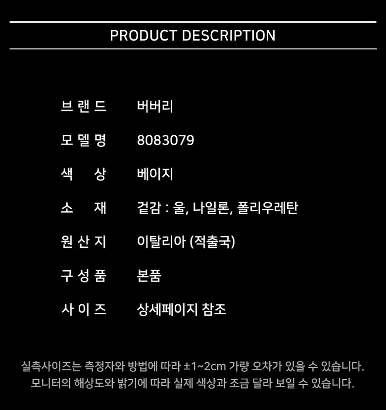 | 1. 제품 소재 (섬유의 조성 또는 혼용률을 백분율로 표시, 기능성인 경우 성적서 또는 허가서) | 상세페이지 참조 |