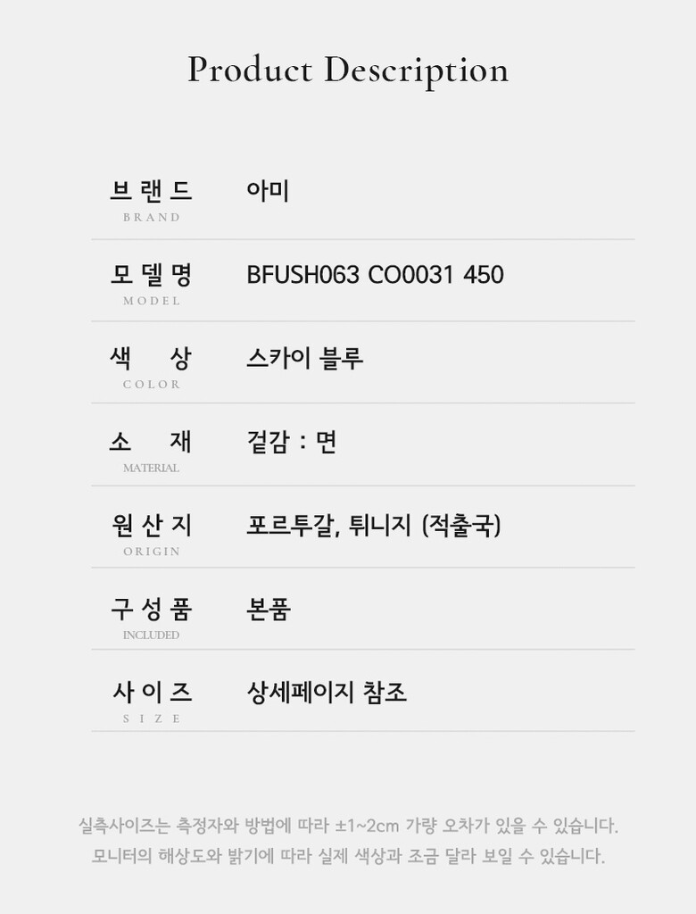 | 1. 제품 소재 (섬유의 조성 또는 혼용률을 백분율로 표시, 기능성인 경우 성적서 또는 허가서) | 상세페이지 참조 |