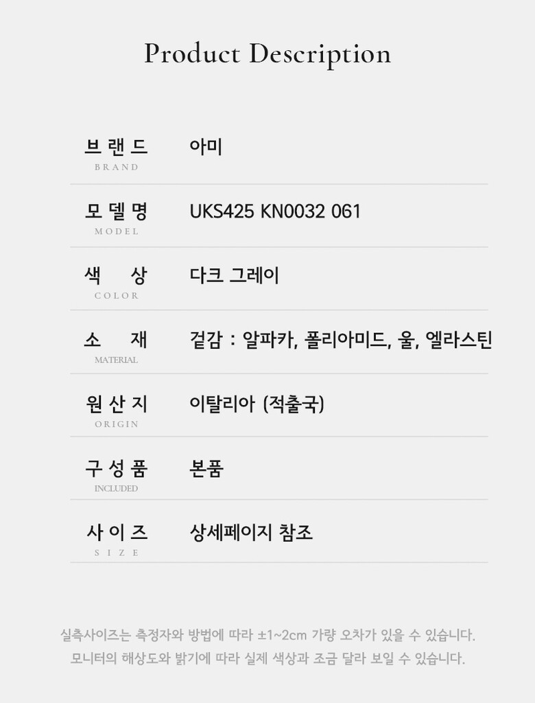 | 1. 제품 소재 (섬유의 조성 또는 혼용률을 백분율로 표시, 기능성인 경우 성적서 또는 허가서) | 상세페이지 참조 |