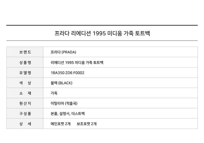 - #리본즈코리아 #1BA350ZO6F0002 #[명품] #프라다 #리에디션 #1995 #미디움 #가죽 #토트백 #블랙 #1BA350 #ZO6 #F0002 #여성 #가방/핸드백