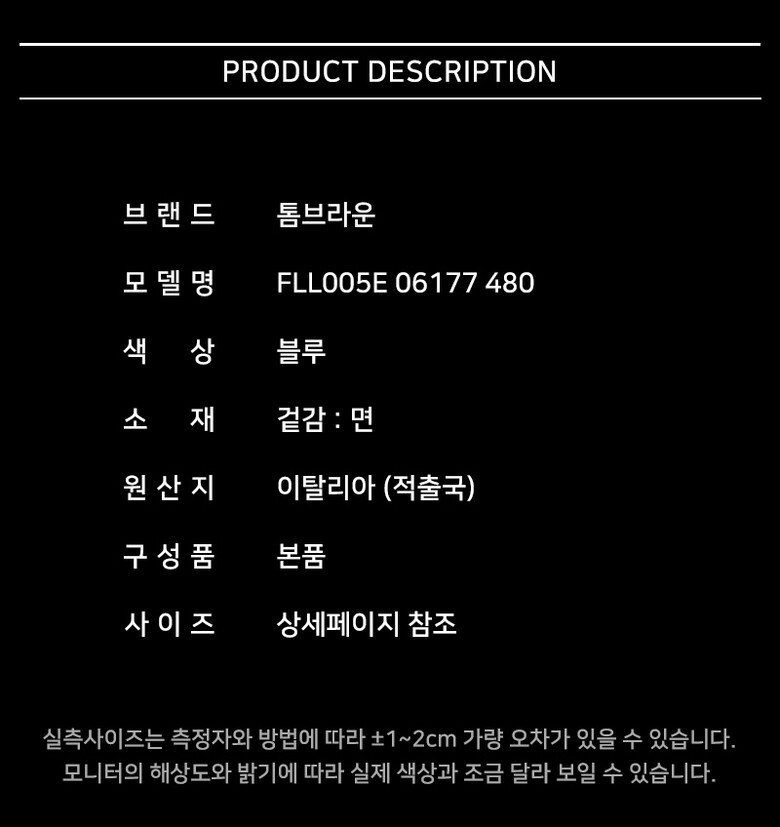 | 1. 제품 소재 (섬유의 조성 또는 혼용률을 백분율로 표시, 기능성인 경우 성적서 또는 허가서) | 상세페이지 참조 |
