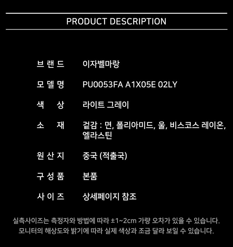 | 1. 제품 소재 (섬유의 조성 또는 혼용률을 백분율로 표시, 기능성인 경우 성적서 또는 허가서) | 상세페이지 참조 |