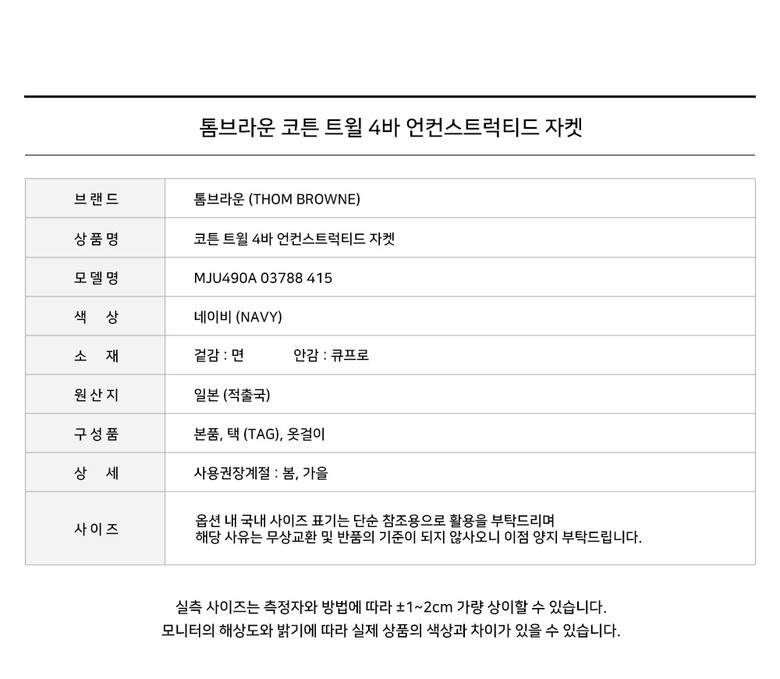 - #리본즈코리아 #MJU490A03788415 #[명품] #톰브라운 #코튼 #트윌 #4바 #언컨스트럭티드 #자켓 #네이비 #MJU490A #03788 #415 #남성 #의류 #아우터 #블레이저
