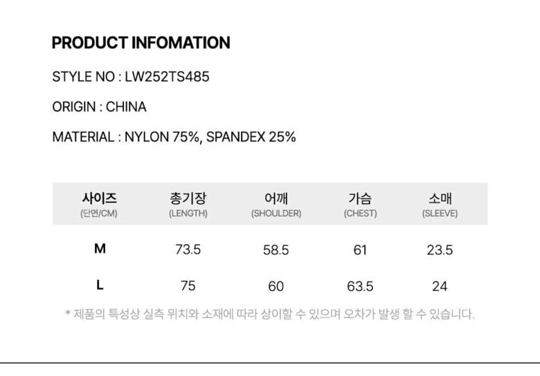 | 1. 제품 소재 (섬유의 조성 또는 혼용률을 백분율로 표시, 기능성인 경우 성적서 또는 허가서) | 겉감:나일론 75%, 폴리우레탄 25% |