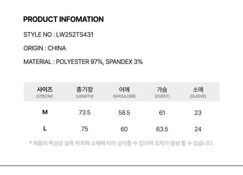 | 1. 제품 소재 (섬유의 조성 또는 혼용률을 백분율로 표시, 기능성인 경우 성적서 또는 허가서) | 겉감:폴리에스테르 97%, 폴리우레탄 3% |