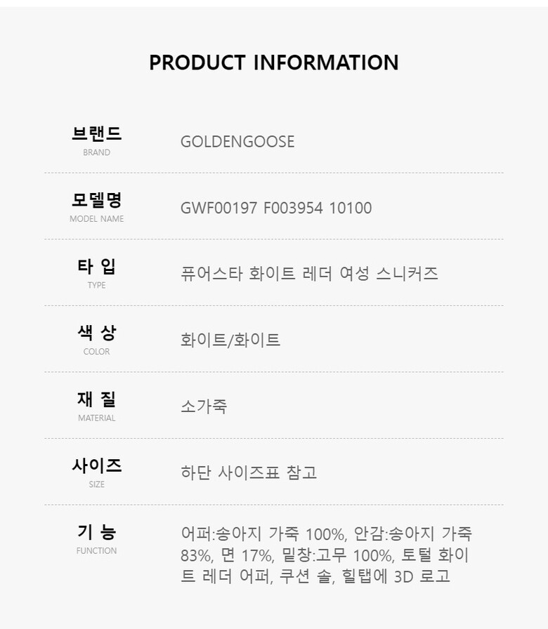 | 1. 제품 소재 (운동화인 경우에는 겉감, 안감을 구분하여 표시) | 상세페이지 참조 |