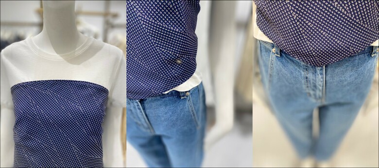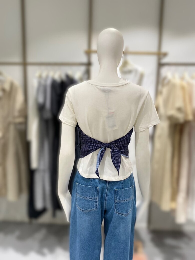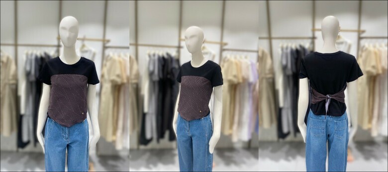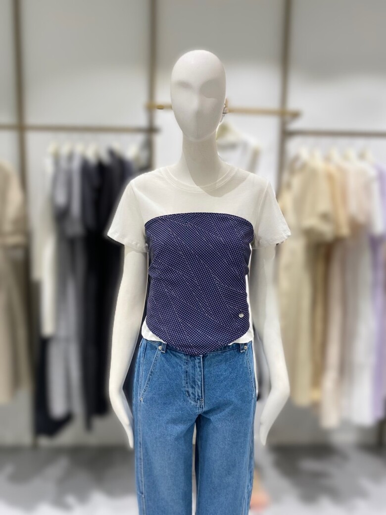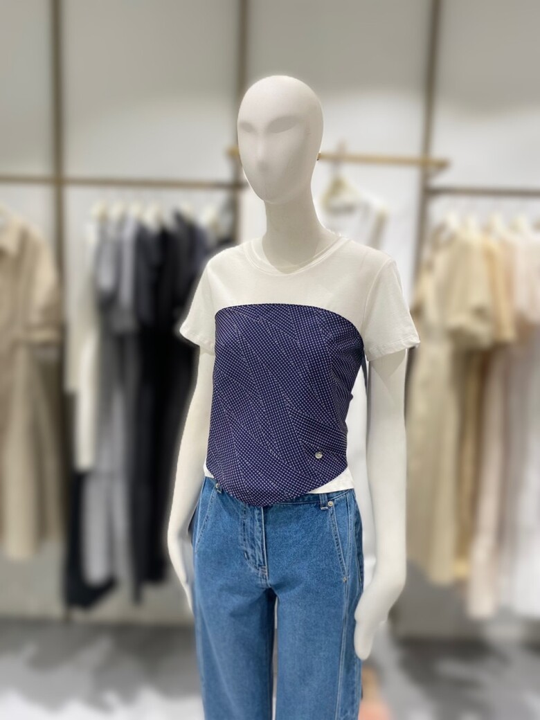 유니크한 덧장배색 포인트 티셔츠입니다.