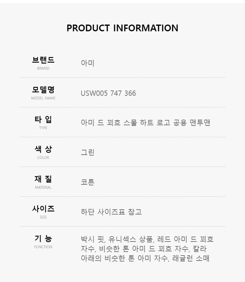 | 1. 제품 소재 (섬유의 조성 또는 혼용률을 백분율로 표시, 기능성인 경우 성적서 또는 허가서) | 상세페이지 참조 |