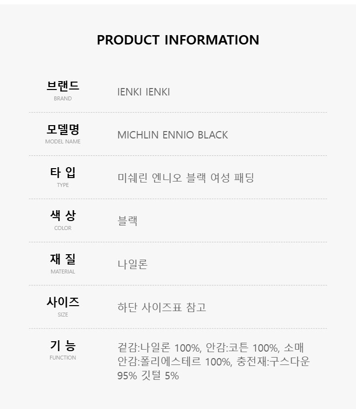[명품] 옌키옌키 MICHLIN ENNIO BLACK 미쉐린 엔니오 블랙 여성 패딩
