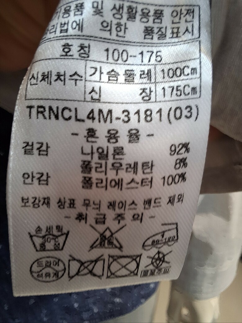 | 1. 제품 소재 (섬유의 조성 또는 혼용률을 백분율로 표시, 기능성인 경우 성적서 또는 허가서) | 폴리우레탄 8% / 안감:폴리에스테르 100% / 겉감:나일론 92%, 폴리우 |