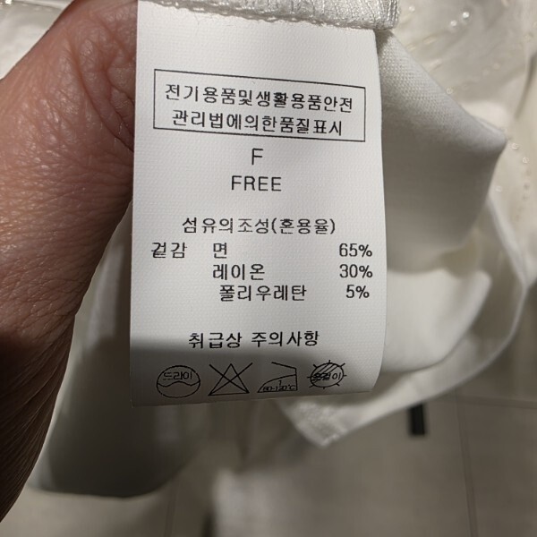 | 1. 제품 소재 (섬유의 조성 또는 혼용률을 백분율로 표시, 기능성인 경우 성적서 또는 허가서) | 면 65% 레이온 30% 폴리우레탄 5% |