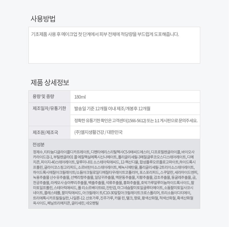 | 9. 사용 시 주의사항 | 1. 화장품을 사용 중 붉은 반점, 부어오름, 가려움증, 자극 등의 이상이 있는 경우, 적용 부위가 직사광선에 의하여 이상이 생긴 경우 사용을 중지하시고 피부과 전문의와 상담하세요. 2. 상처가 있는 부위, 습진 및 피부트러블 등의 이상이 있는 부위에는 사용하지 마세요. 3. 보관 및 취급시 주의사항 가)사용 후에는 반드시 마개를 닫아두세요. 나)유아ㆍ소아의 손이 닿지 않는 곳에 보관하세요. 다)고온 다습한 곳 및 직사광선 닿는 장소는 피해주세요. |