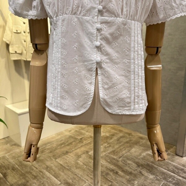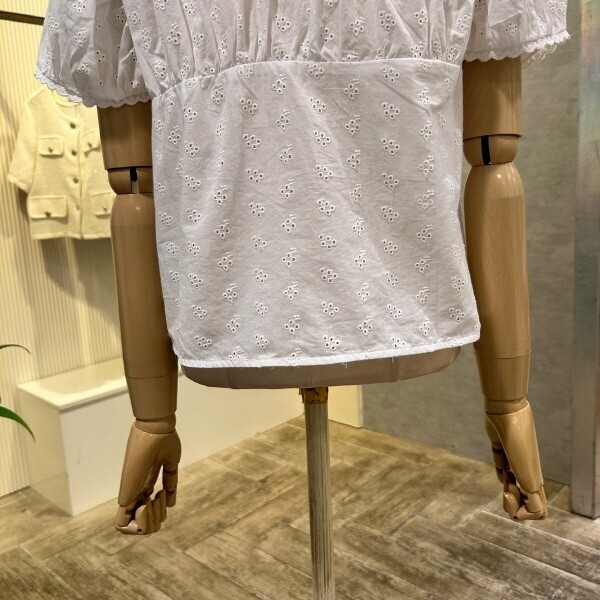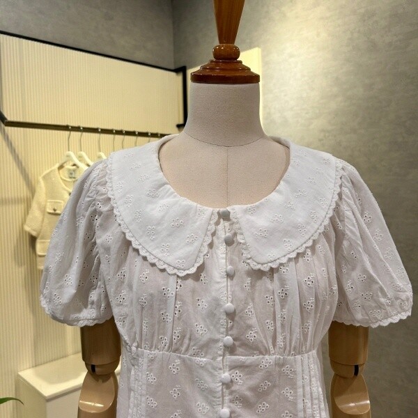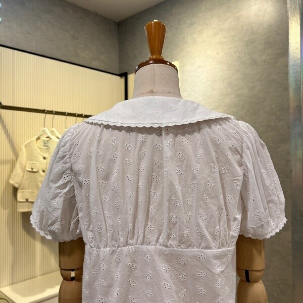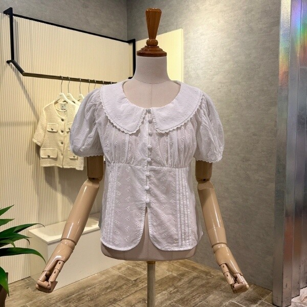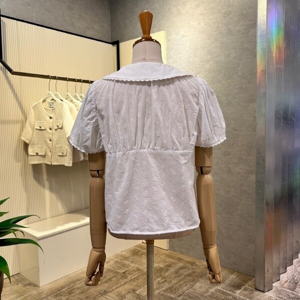 2025년 s/s 신상 크롭 자수 펀칭 카라 블라우스 입니다.