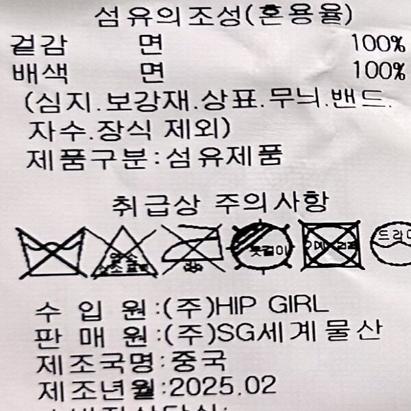 (실밥,박음질,초크자국,단추마감, 섬유특유의 냄새)