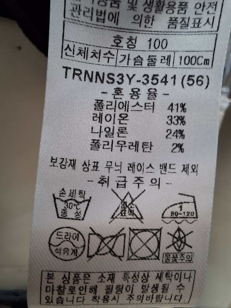 | 1. 제품 소재 (섬유의 조성 또는 혼용률을 백분율로 표시, 기능성인 경우 성적서 또는 허가서) | 폴리에스테르 41%, 레이온 33%, 나일론 24%, 폴리우레탄 2% |