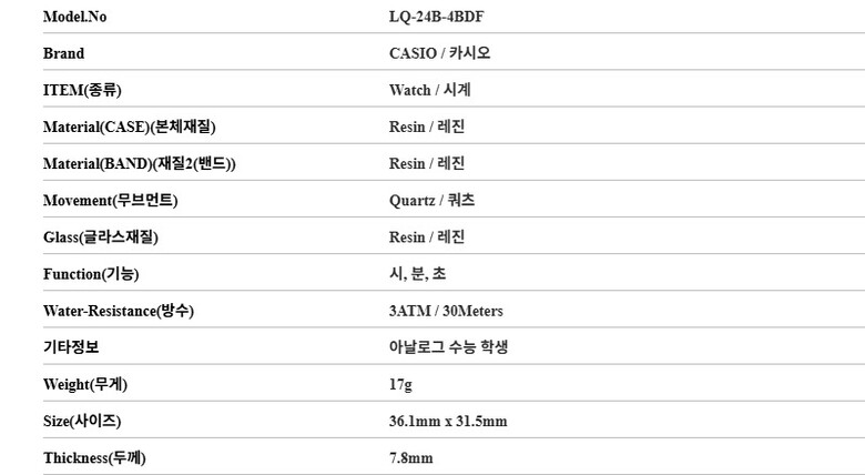 | 7. 주요 사양 | 레진 시계 쿼츠 |
