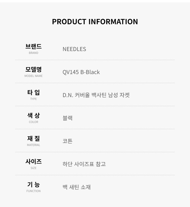 니들스 QV145 B-Black D.N. 커버올 백사틴 남성 자켓