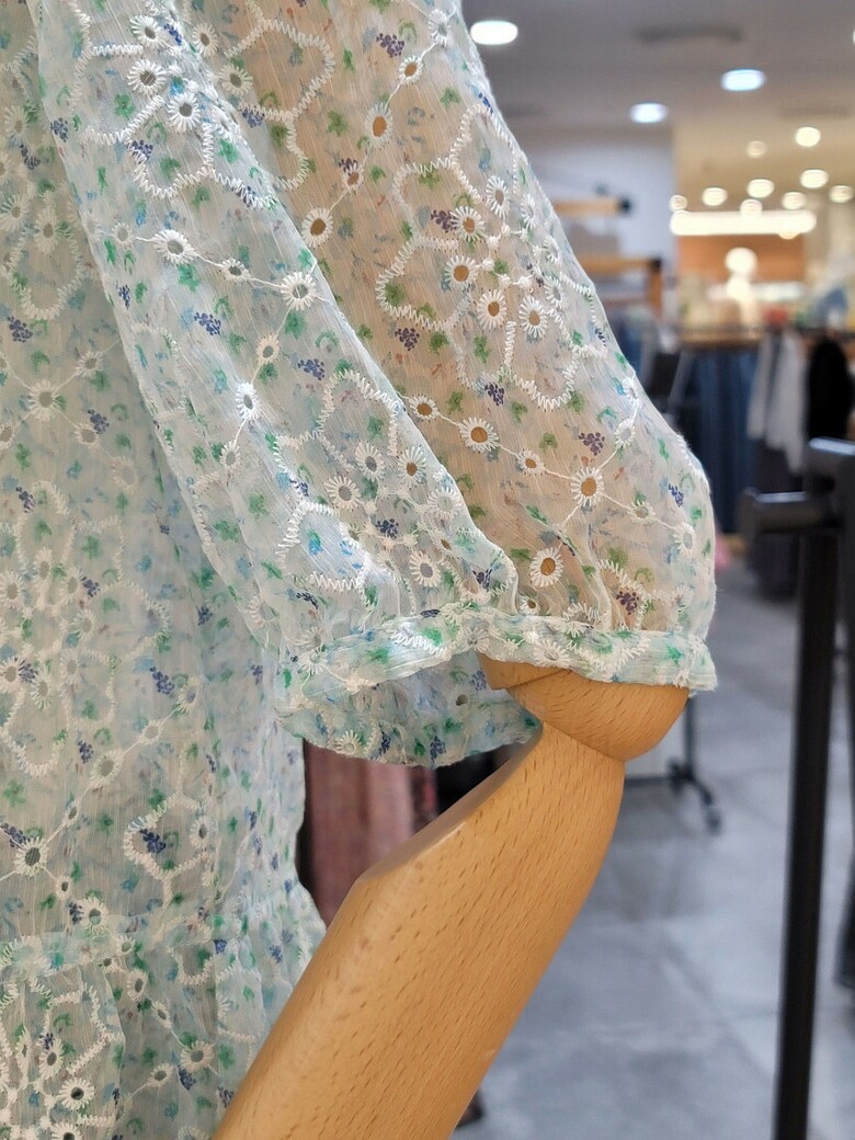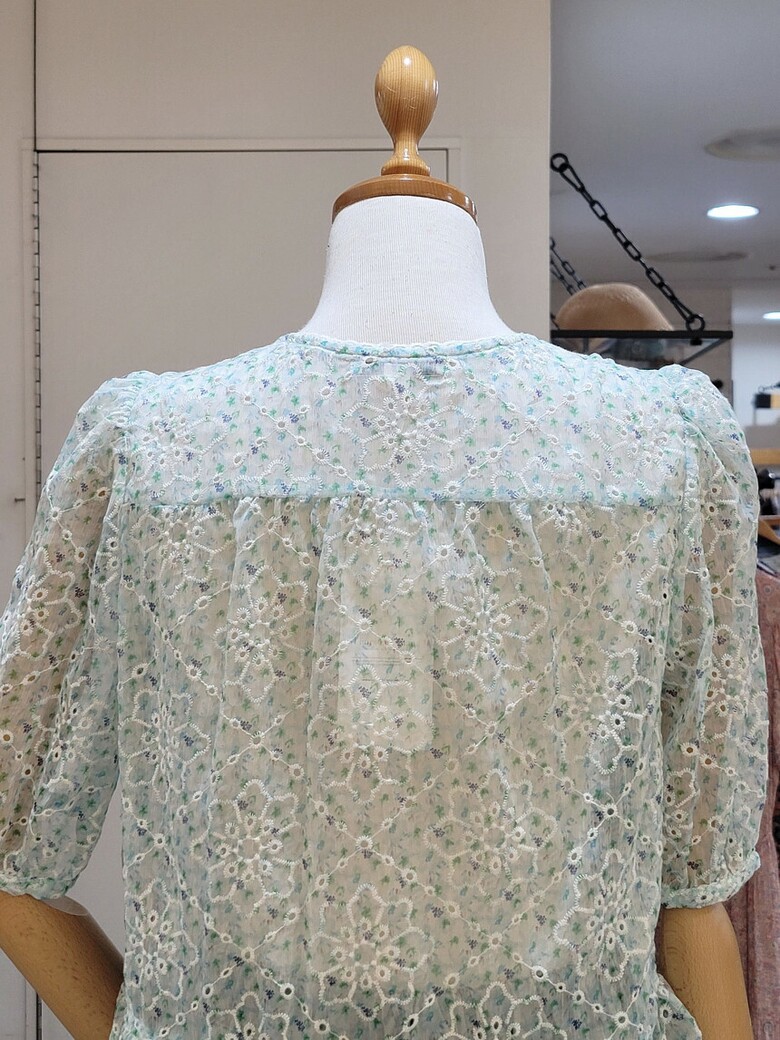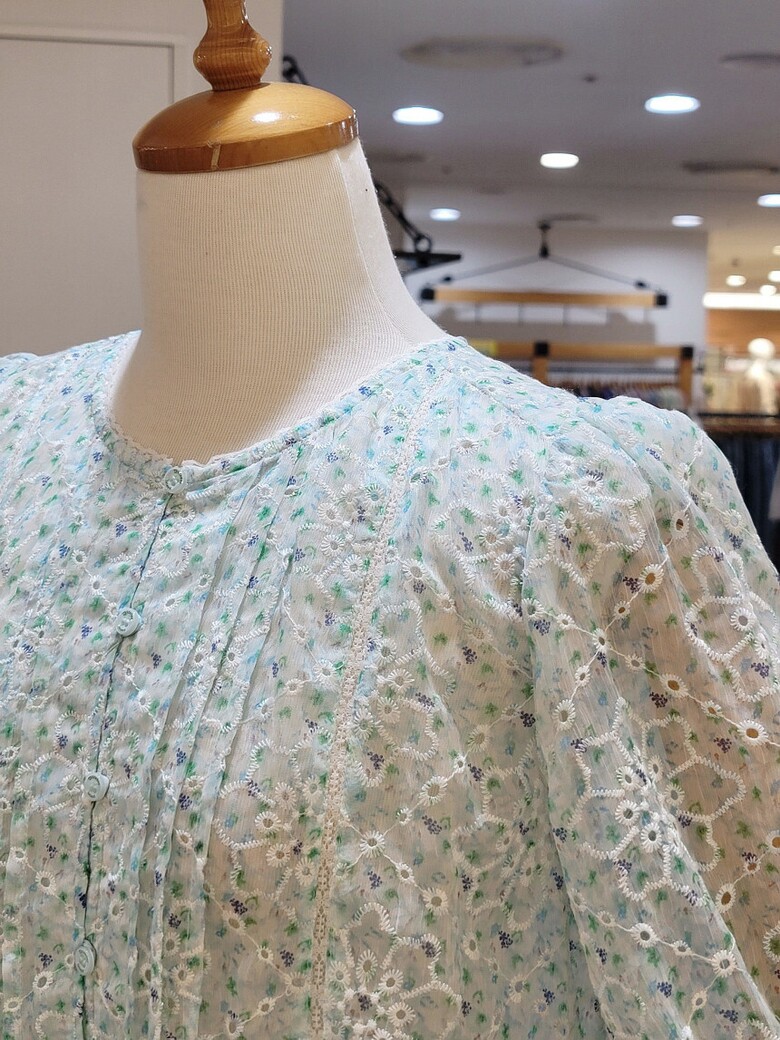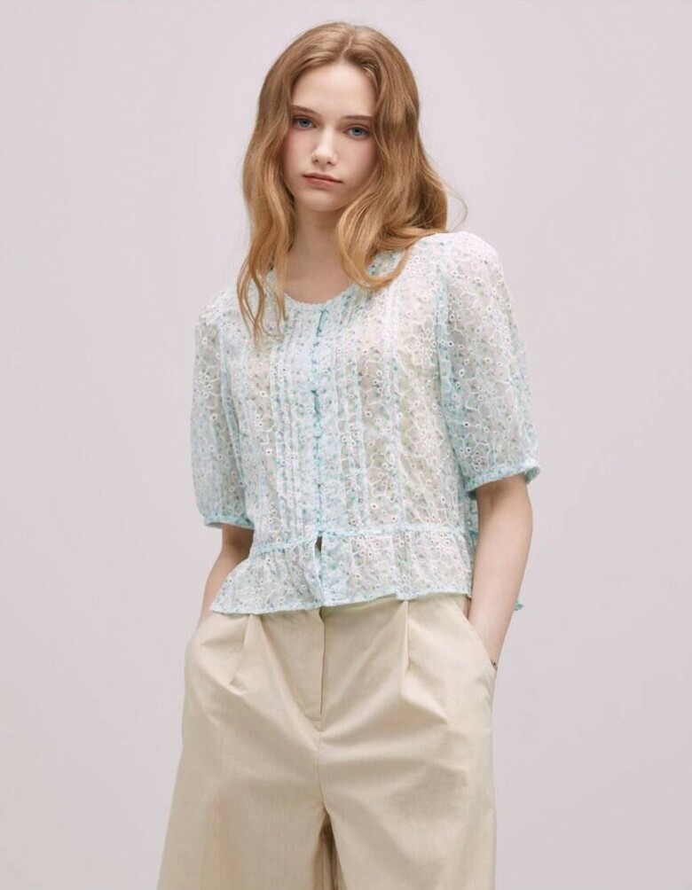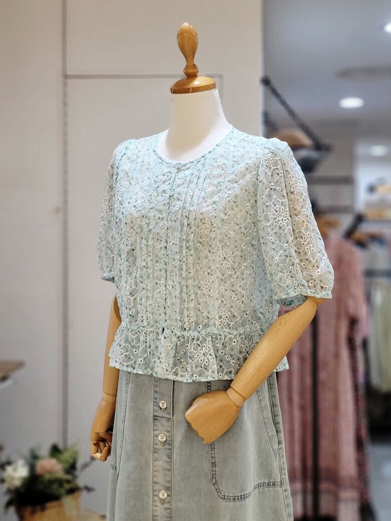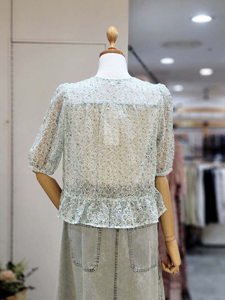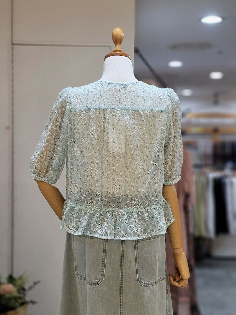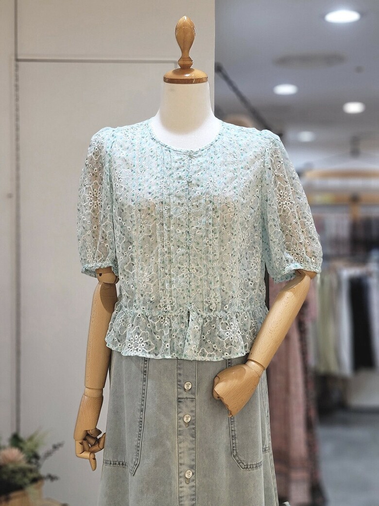 은은한 나염과 펀칭 레이스가 믹스된 라운드넥의 블라우스입니다.