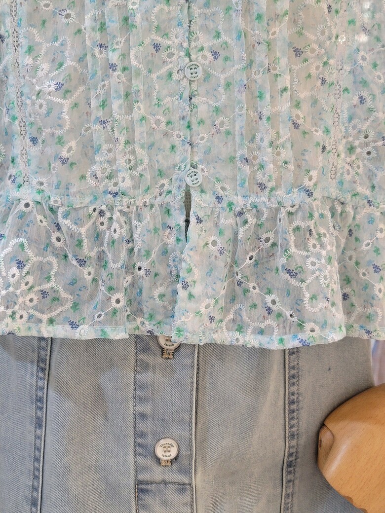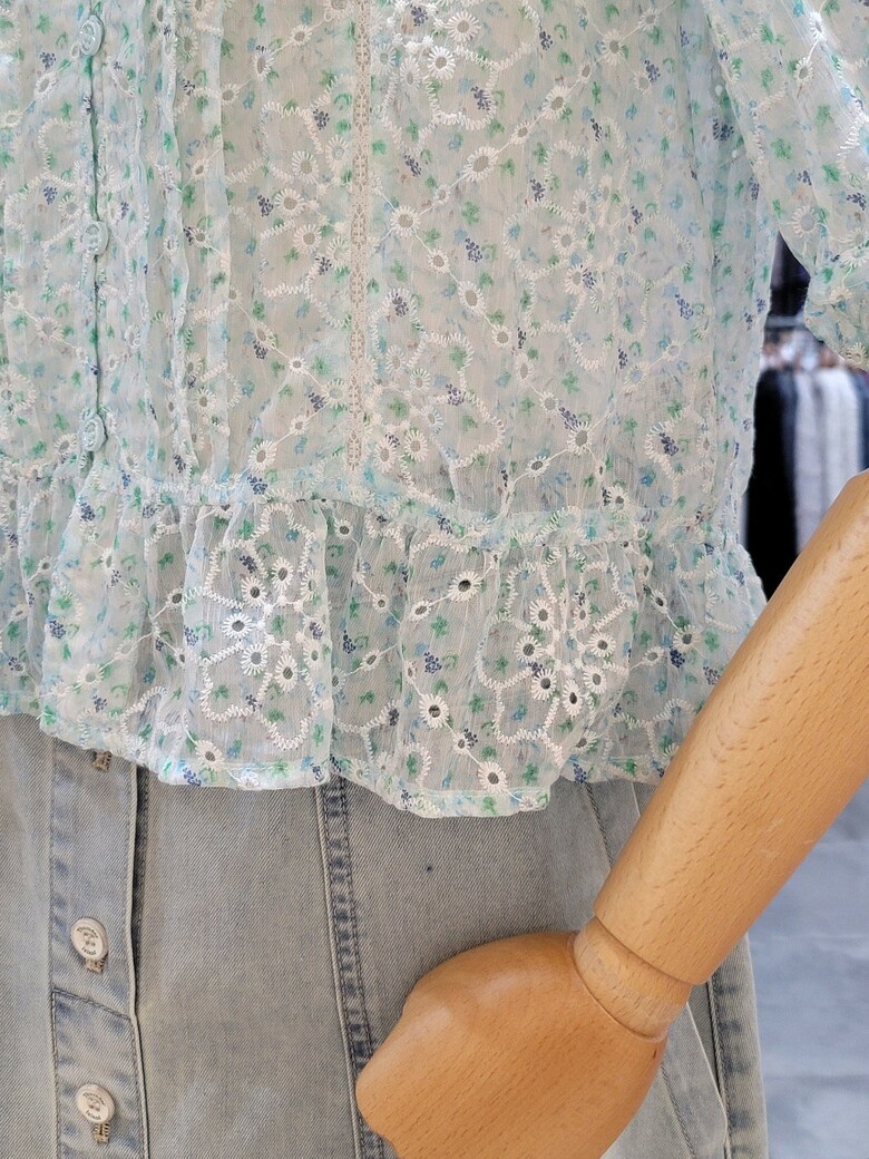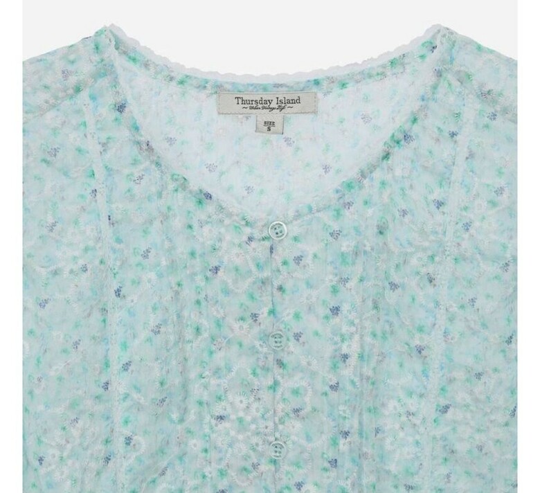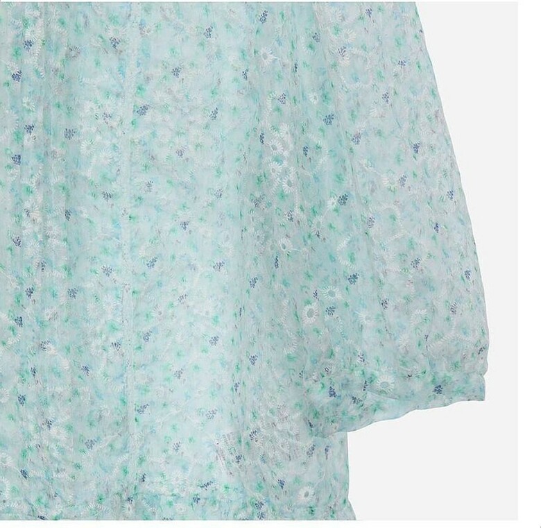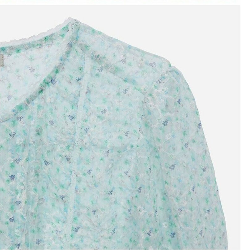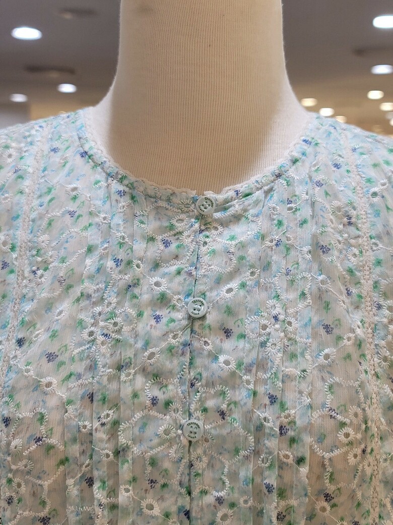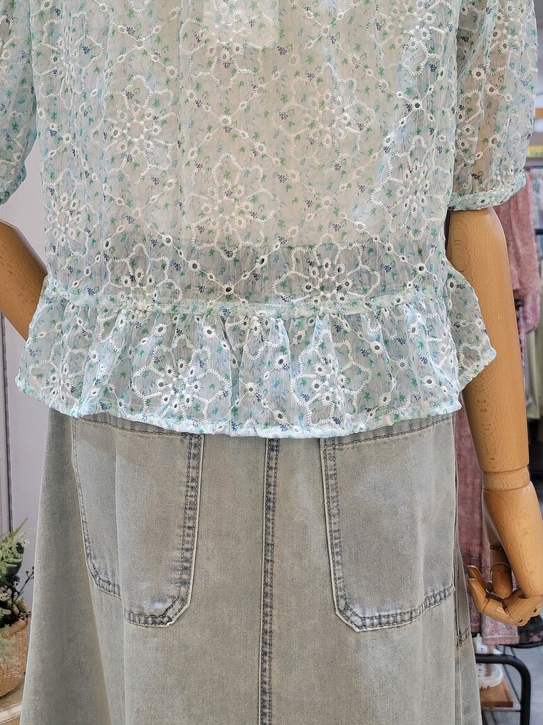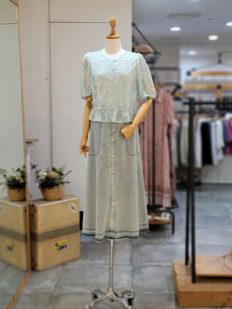 은은한 나염과 펀칭 레이스가 믹스된 라운드넥의 블라우스입니다.
