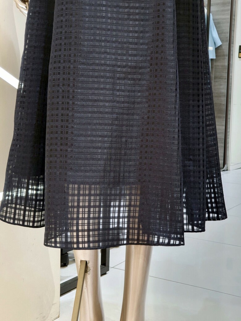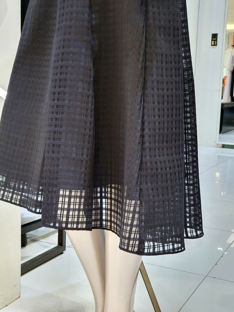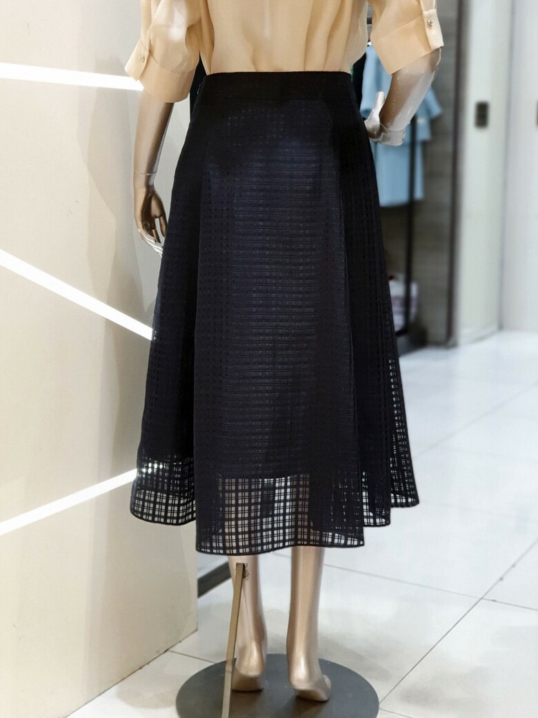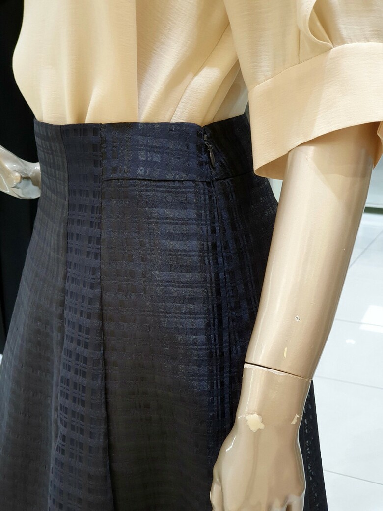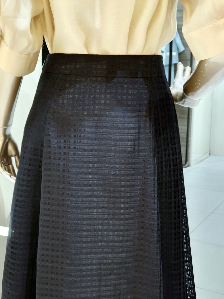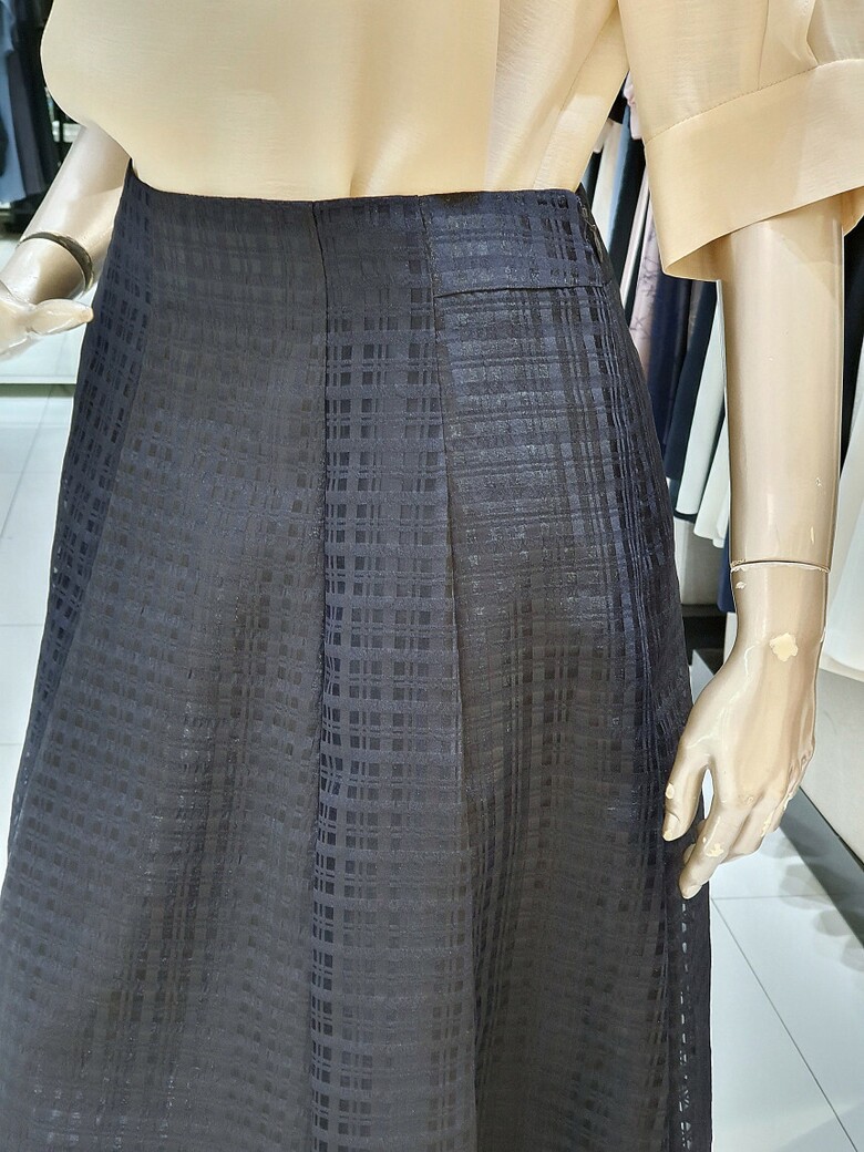 체크 패턴으로 포인트를 주며 플레어 밑단으로