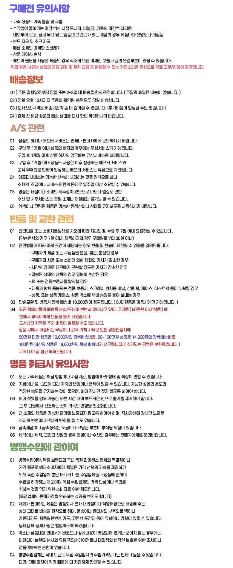 • 모든 규정은 전자상거래법에 의거하며, 택배사정으로 배송이 지연된 경우 재화를 공급받은 날로부터 7일 이내에 반품 가능합니다.