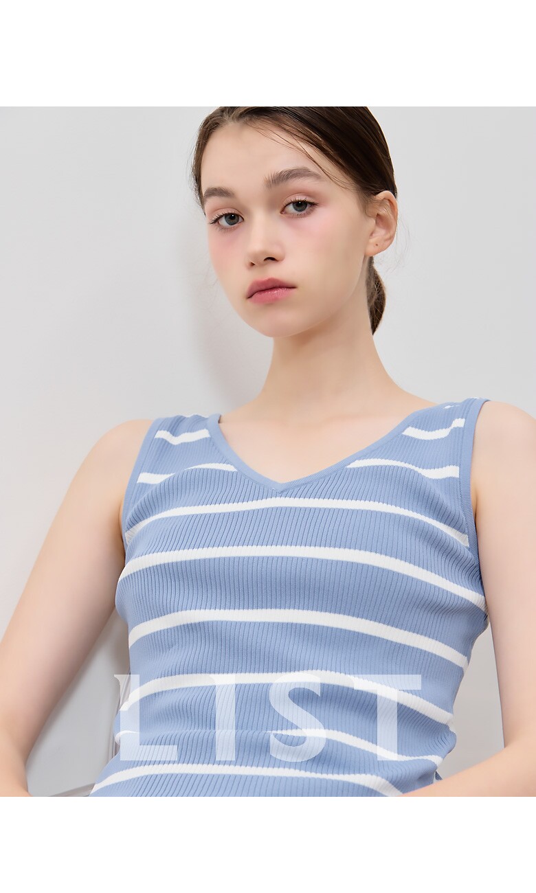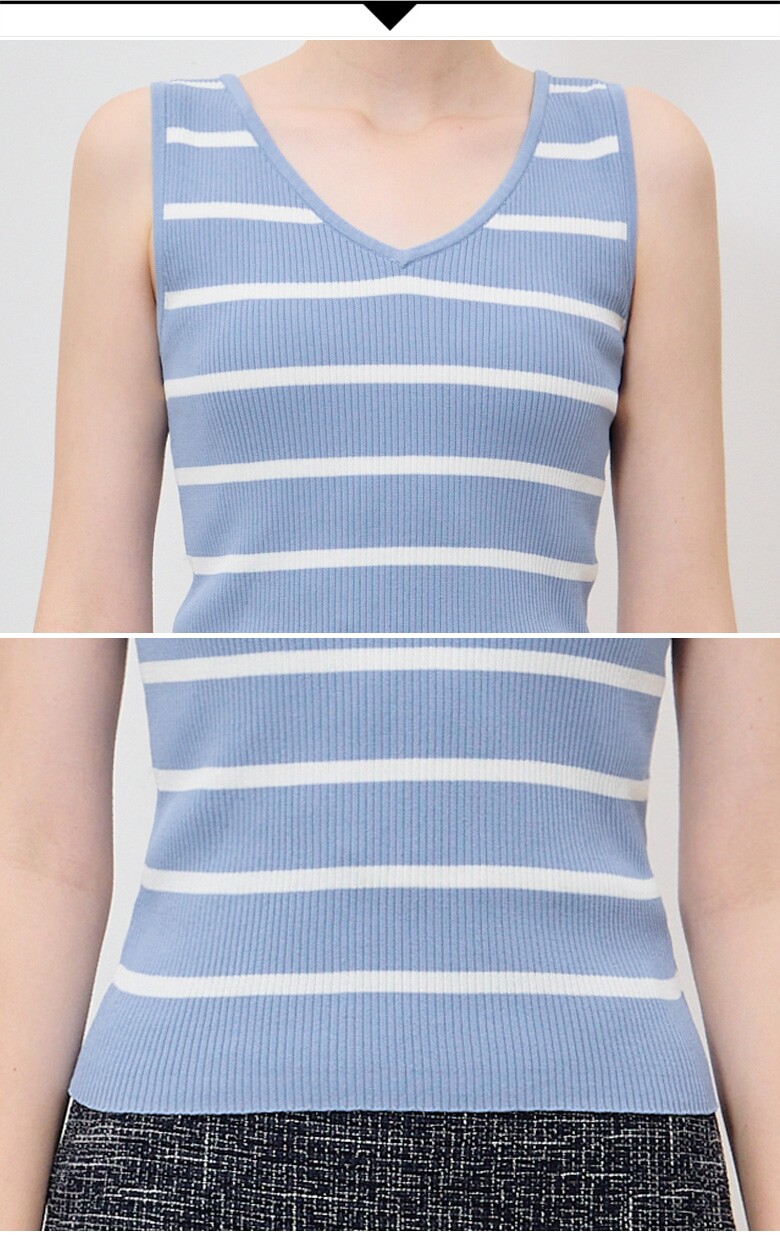 스트라이프 패턴 골지 원단의 브이넥 슬리브리스 니트 탑입니다. 깔끔한 디자인으로 어디에나 활용하기 좋습니다. 브랜드만의 고급 소재를 활용하여 우수한 착용감을 선사합니다.