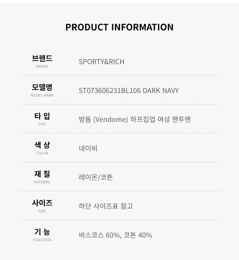 스포티앤리치 맨투맨 ST073606231BL106 DARK NAVY 방돔 하프집업 여성맨투맨 당일발송