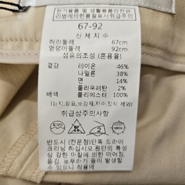 제품소재 : 겉감-레이온46%, 나일론38%, 면14%, 폴리우레탄2%, 배색-폴리에스터100%