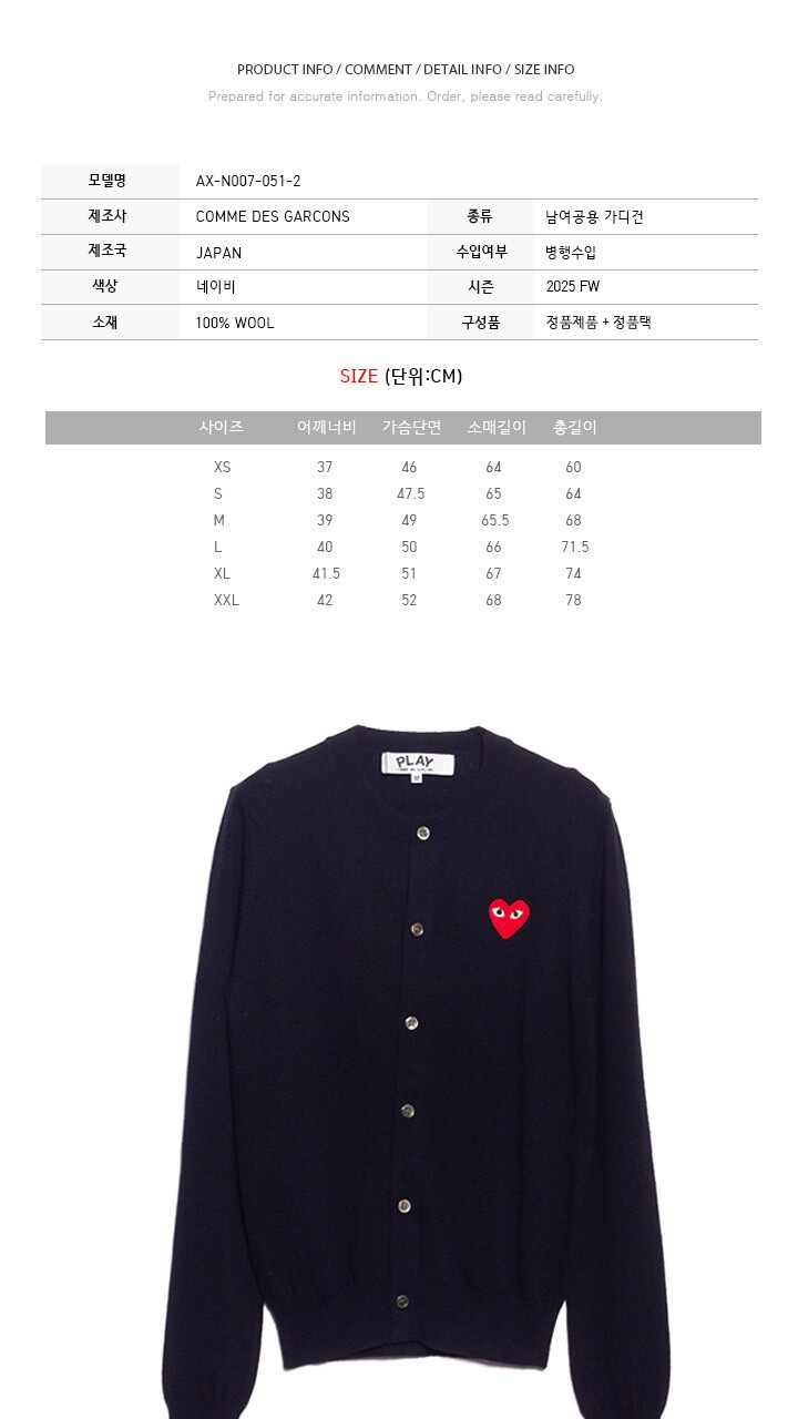 꼼데가르송 25FW 남성 레드 와펜 브이넥 가디건 네이비 AX-N007-051-2
