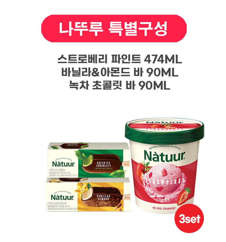 [나뚜루] 파인트 1개+바 2개 세트 (스트로베리 파인트/바닐라&아몬드 바/녹차초콜릿 바)