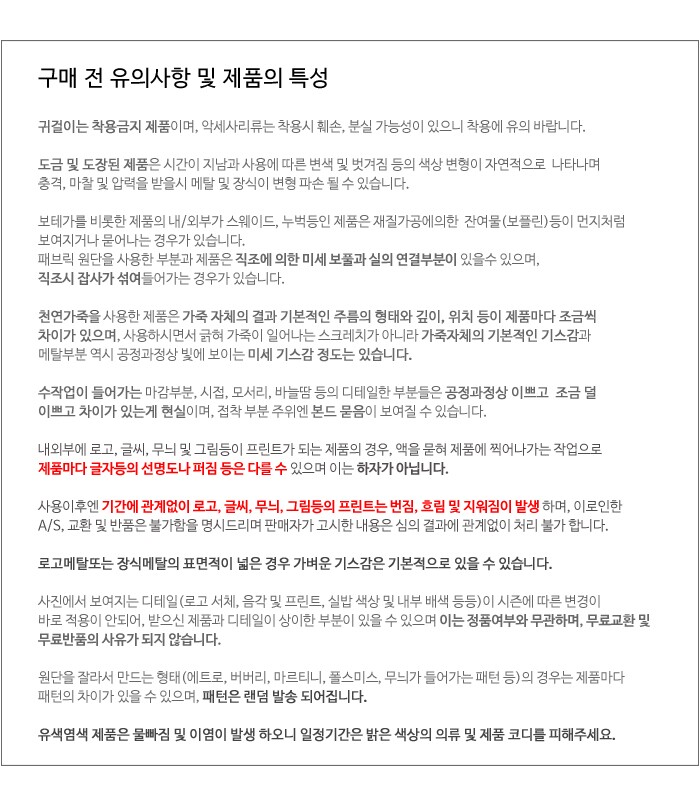 체크포인트 수입품의 특성상 모든 장식물 또는 부품은 사용 이후 손상, 탈락 및 분실시에 동일 부품으로 수선되어질 수 없으며, 대체부품 수선시도 유상 수선되어짐을 명시 드립니다. 하단의 구매전 주의사항 및 판매자 공지 확인후 구매 바랍니다.