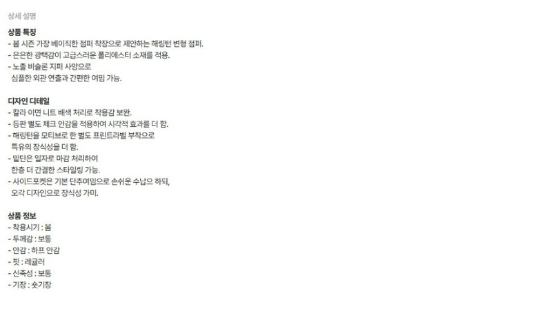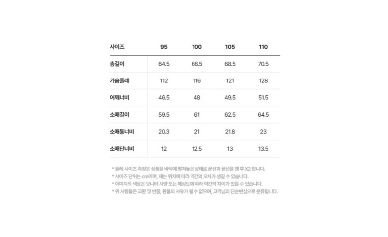 | 1. 제품 소재 (섬유의 조성 또는 혼용률을 백분율로 표시, 기능성인 경우 성적서 또는 허가서) | 상품상세참조 |