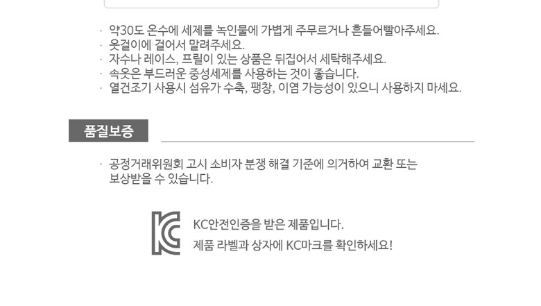 | 6. 세탁방법 및 취급시 주의사항 | 30도 온수로 중성세제를 사용하여 손세탁 및 분리세탁을 권장합니다. |