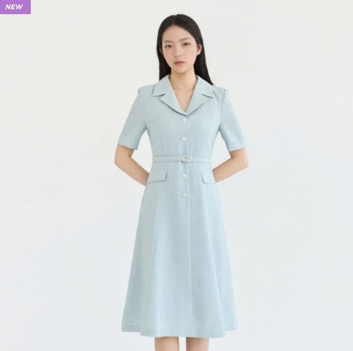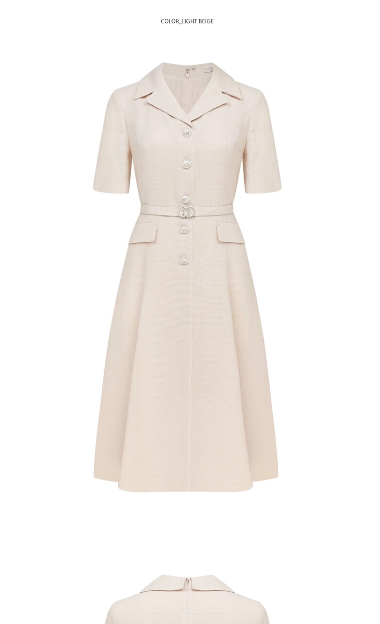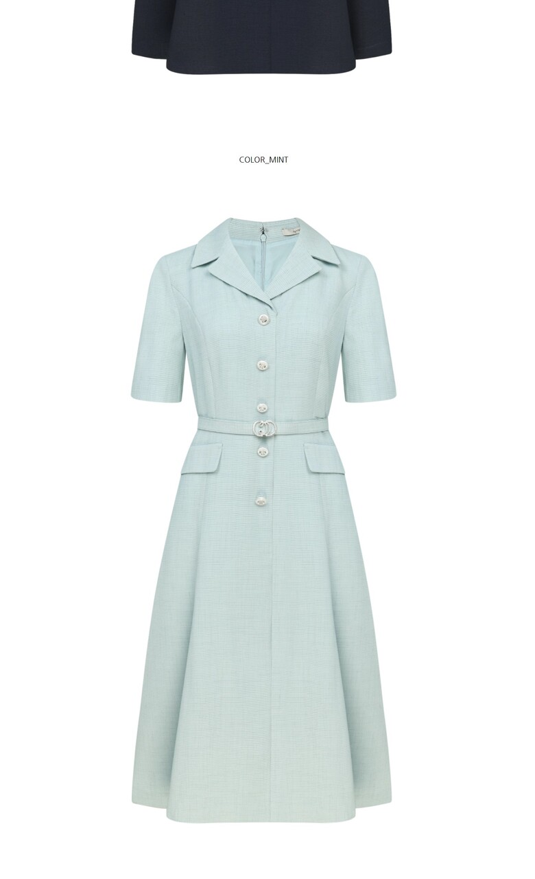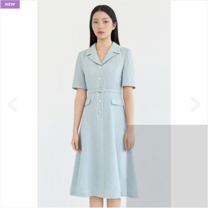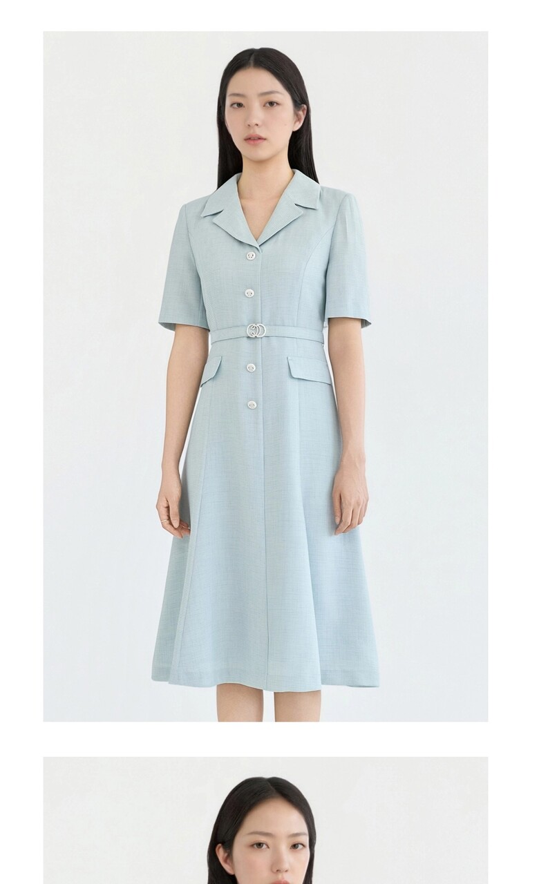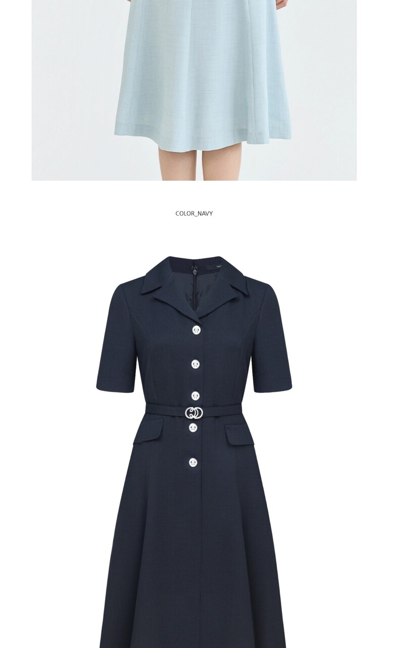 오픈카라와 실버 버튼이 매력적인 세미 A라인 원피스입니다.