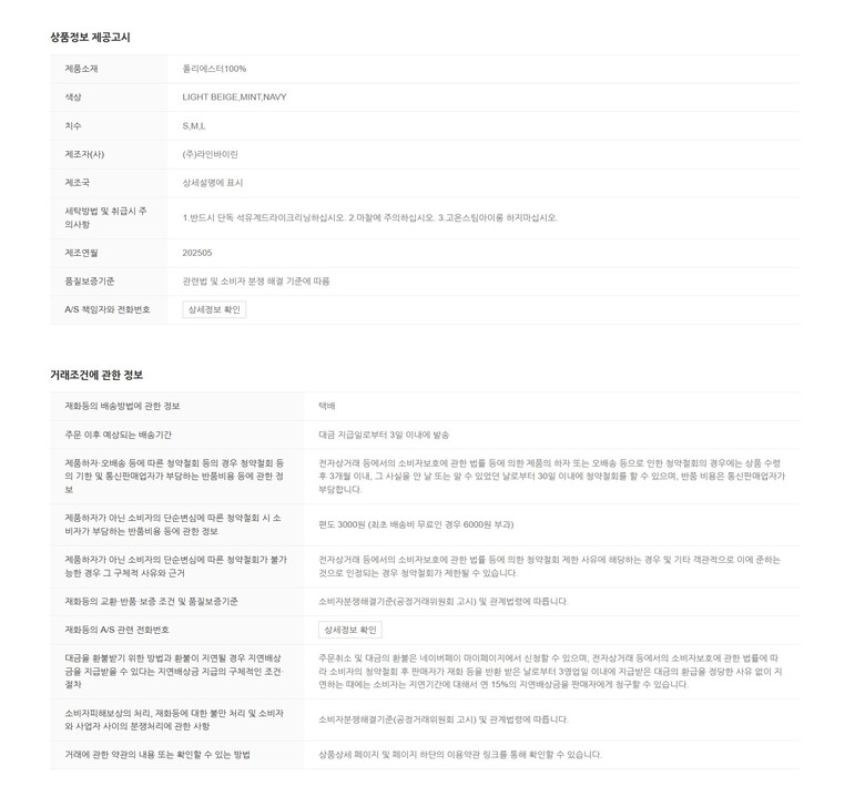 1. 제품 소재 (섬유의 조성 또는 혼용률을 백분율로 표시, 기능성인 경우 성적서 또는 허가서) 상품상세참조