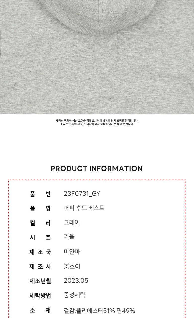 1. 제품 소재 (섬유의 조성 또는 혼용률을 백분율로 표시, 기능성인 경우 성적서 또는 허가서) | 겉감:폴리에스터51% 면49% |