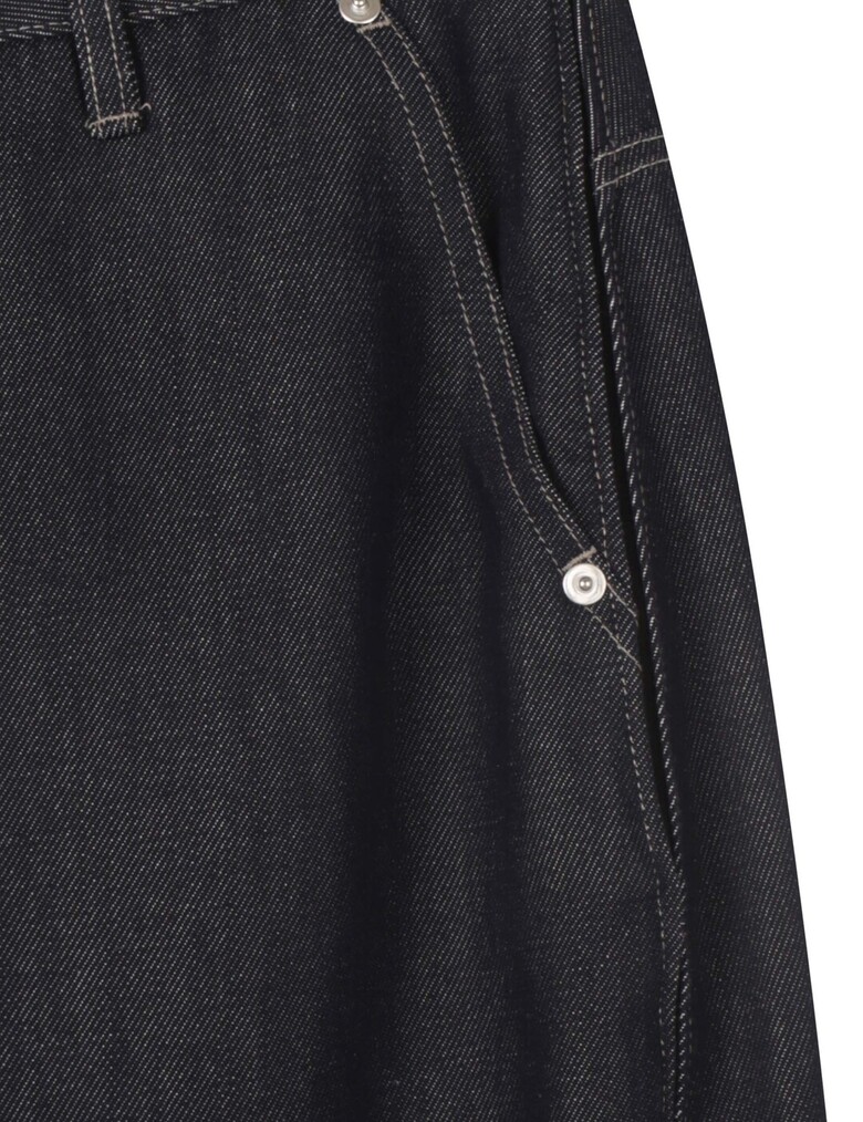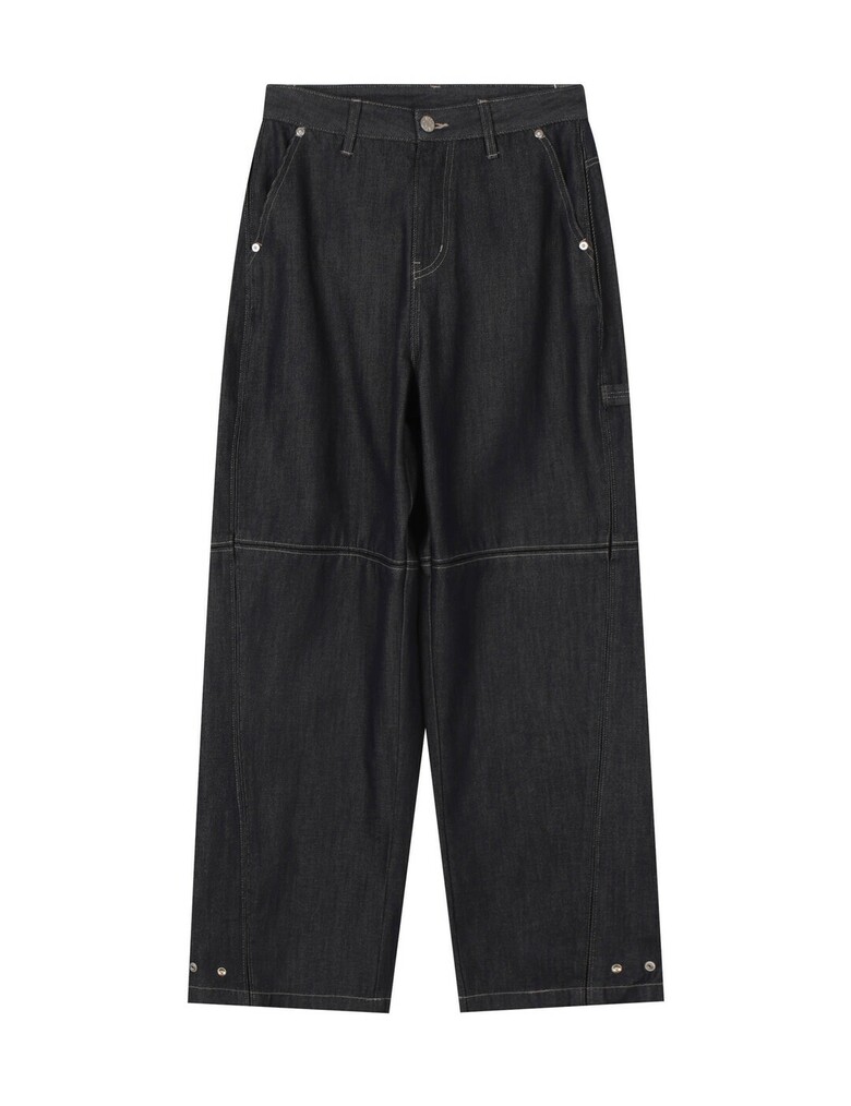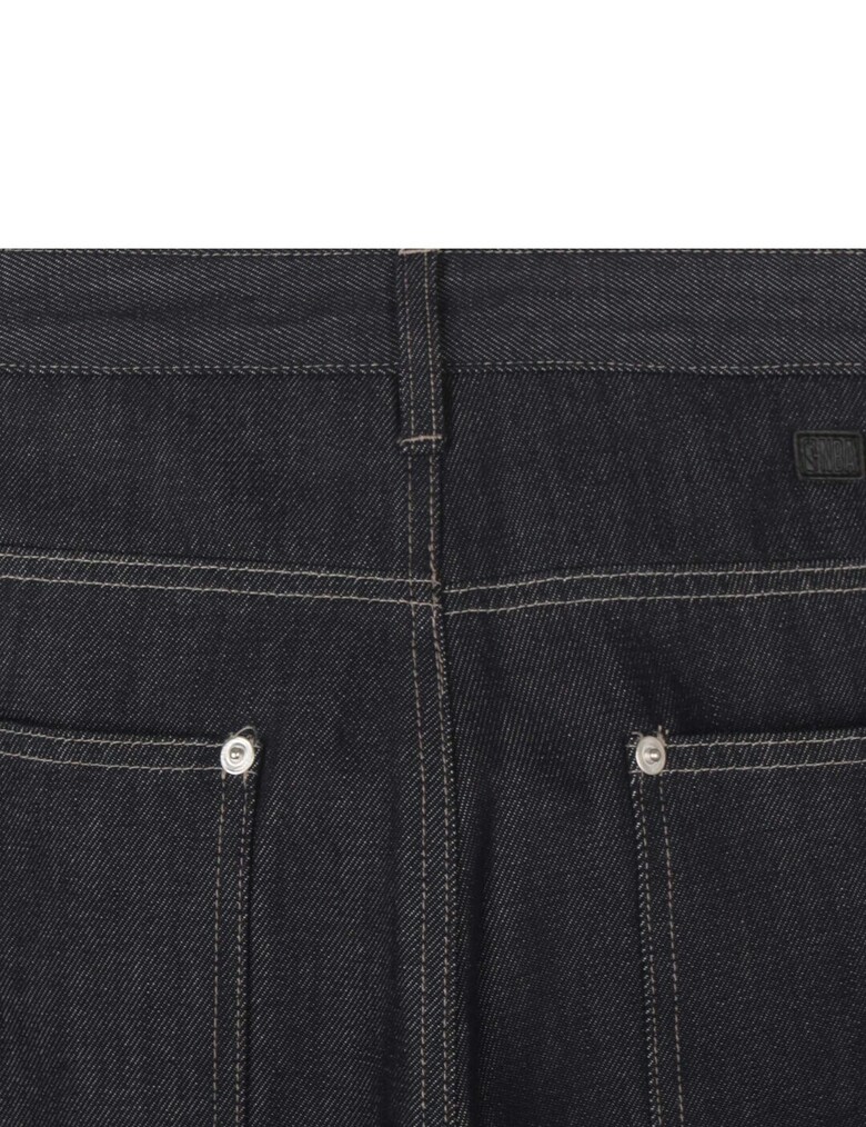 제 원단 패널 패치 사이에 움직일때마다 타소재가 보이며 밑단에 스냅버튼으로 사이즈 조절이 가능함