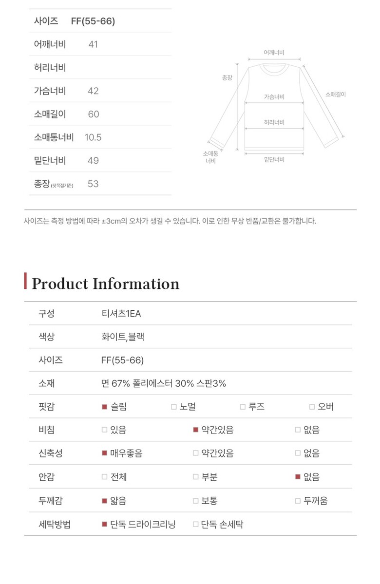 1. 제품 소재 (섬유의 조성 또는 혼용률을 백분율로 표시, 기능성인 경우 성적서 또는 허가서) | 면 67% 폴리에스터 30% 스판3% |